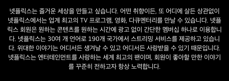 그렇게 세상에 나온 것이 현재의 '넷플릭스'이다. 넷플릭스는 고객 경험 개선과 더 즐거운 세상을 만들기 위해 앱을 TV, 스마트폰, PC 등을 통해 서비스하고 있으며 1) 언제 어디서나 원하는 콘텐츠를 볼 수 있는 스트리밍 기능 2) Netflix original 콘텐츠 제작 등을 포함한 다양한 종류의 콘텐츠 3) 개인 맞춤형 추천 알고리즘의 기능을 제공하여 전 세계 많은 이들에게 비디오 콘텐츠를 보며 느낄 수 있는 즐거운 경험을 만들어내고 있다.