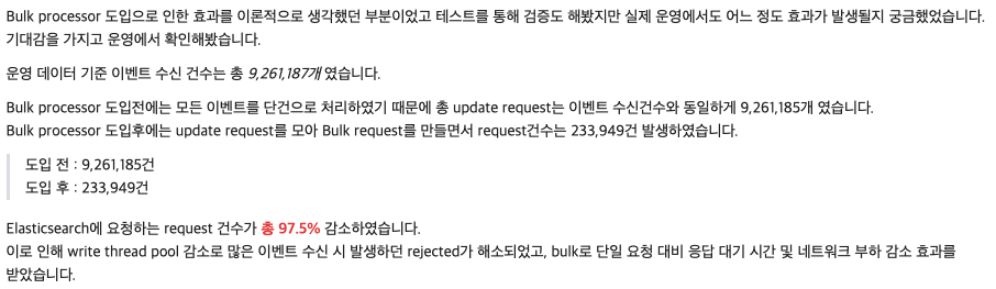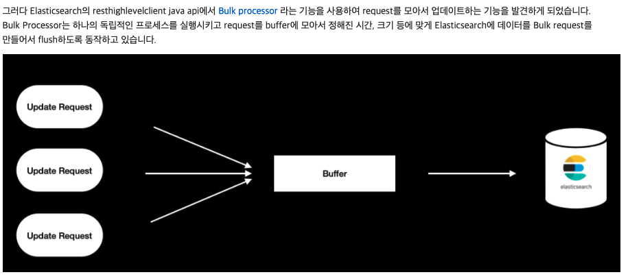 위의 나타나는 문제를 해결하기 위해 들어오는 이벤트를 묶어서(bulk) 처리하는 API를 사용했다고 한다. 데이터 변경 request를 모아 buffer(요청을 모아 놓는 임시 저장소 정도로 이해)에서 일정한 기준에 맞게 데이터를 처리하여 해당 문제를 해결하기 때문에 기존의 건 바이 건 request 보다 리소스를 덜 쓰면서 데이터를 처리할 수 있다.