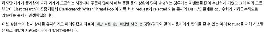 가게나 리뷰 등에서 발생하는 이벤트(변경사항 정도로 이해할 수 있음)를 건 바이 건으로 수집하는 방법은, 데이터가 과도하게 몰리는 경우에 수많은 이벤트 수신으로 Elasticsearch Writer Thread Pool에 과부하를 만든다. 그에 따라 데이터를 추가하는 요청(Request)이 거절되거나 Disk I/O 문제로 CPU 수치가 급격하게 올라가는 문제가 발생했다고 한다.