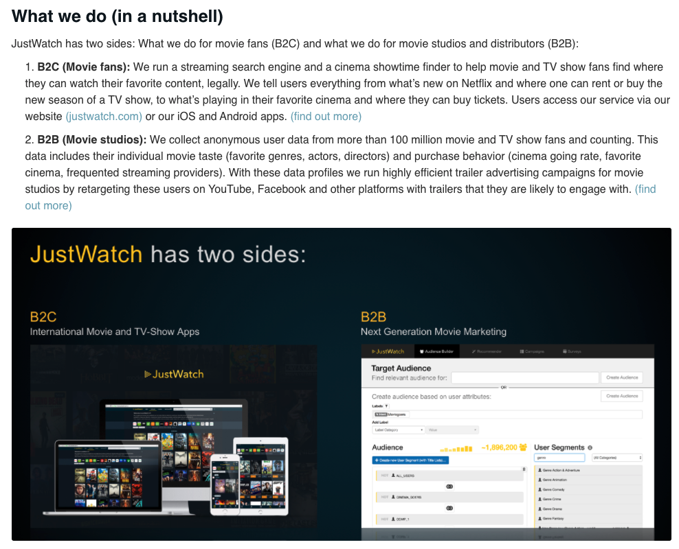 2) 전체 수익 중 70%가 고객 데이터 판매에서 창출된다. 콘텐츠 제작 기업에게 고객 행동 데이터를 수집하고 정제하여 판매한다. 저스트워치 CEO에 따르면 최종 목표는 콘텐츠 데이터 기업으로 데이터를 기반으로 조언하는 영향력을 갖는 것이라고 한다.